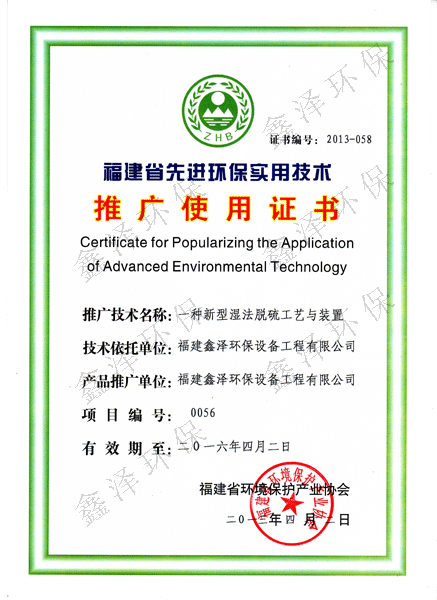 福建省先进环保实用技术推广使用证书(一种新型湿法脱硫工艺与装置)