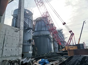 本月,由我司承建的中伟新材料股份有限公司印尼***项目烟气脱硫 EPC 工程建设有序推进,各环节工作按计划稳步开展。 3#、4#脱硫系统方面,一级塔、二级塔及直排烟囱封顶后,正进行完善工作。塔内除雾器、喷淋层、托盘、氧化空气管等关键设备的安装工作正在有条不紊地进行,施工人员严格按照操作规范,确保每一个设备的安装精准无误。同时,塔外设备安装和管道安装也在同步推进,各工种之间紧密配合,保证施工进度的连贯性。