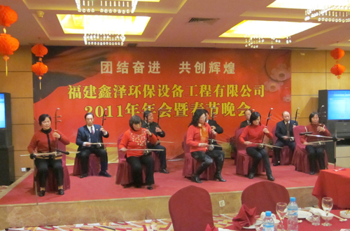 首先,由吴金泉董事长作了精彩致辞,他指出2011年我们必须创新、创优、革新,进一步抓好科研、生产与管理,为实现十二五规划目标献计出力。当晚,台上节目接踵而至,赢得台下掌声阵阵。研发中心自创的三句半,三男一女台上站,锣鼓齐响,配上应景顺溜的短句,令人赞不绝口;手语《感恩的心》优雅沉缓,感动之余令人深思;六六大顺合唱团,六男六女齐唱《大团圆》,表达团圆之喜悦,送出新年之祝福;由工程副总林顺金亲自创作的诗朗诵——《鑫泽我们的家》、《明天更辉煌》气势磅礴,带给大家不一样的享受和感动;营销部林世峰一曲《康巴汉子》带来高原风、草原情……福大老教授协会对本次晚会鼎力支持,为我们表演了二胡齐奏、表演唱等精彩节目,阵容强大、星光闪烁,为晚会增添了一抹亮丽。