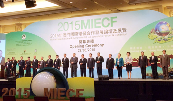 3月2628日,2015 年澳门国际环保合作发展论坛及展览(MIECF)在澳门特别行政区威尼斯人度假村酒店举行。本次活动以“绿色经济—清新空气—绽放商机”为主题,共有50多名来自中国、英国、法国等国家和地区的环保专家出席论坛,约有来自20多个国家和地区的450家参展商参加展览。澳门特别行政区长官崔世安、澳门中联办副主任姚坚、外交部驻澳门公署副特派员潘云东、国家科技部副部长张来武等嘉宾以及来自海内外的环保专家、业界人士逾千人出席了开幕式。